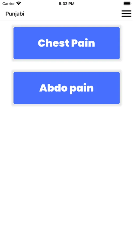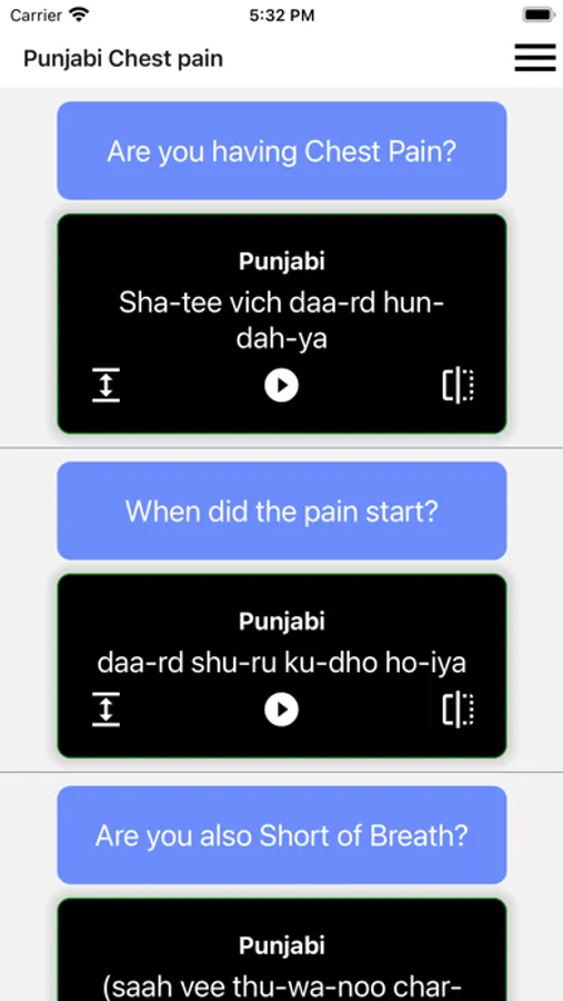App designed by a Paramedic designed to assist medical providers assessing patients with a language barrier. Select between multiple complaints and choose from pre-recorded medical questions that will play in either Punjabi or Mandarin. Both languages also have a translated text so patients may read the questions if audio is difficult to hear due to the environment or the patient is hard of hearing. More languages and assessments to be added to the App in the future.