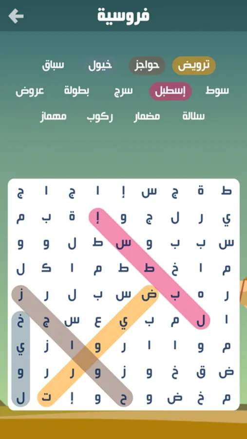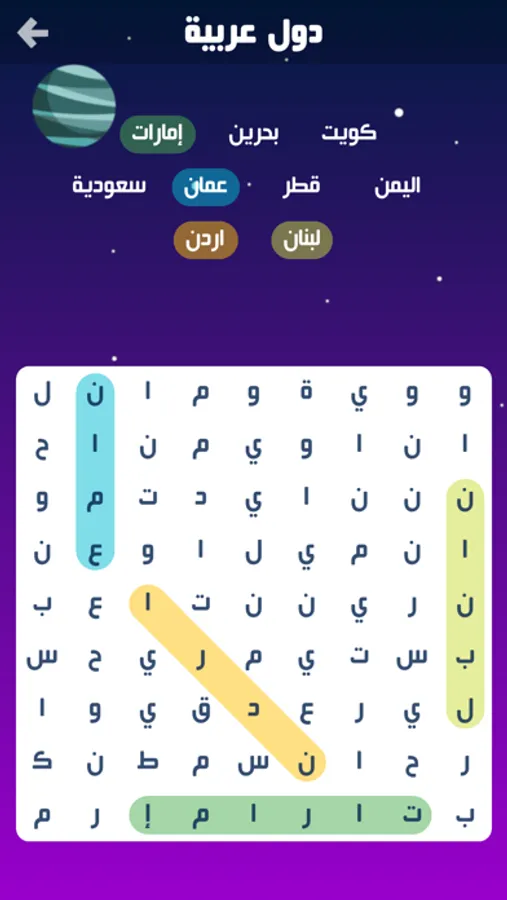 ابحث عن الكلمات المعطاة في شبكة الحروف