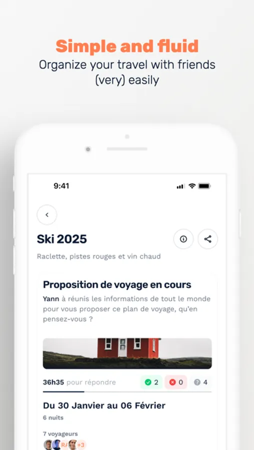 Never miss a booking again. While you're planning your travels, you can use all the information you've gathered to create a travel proposal at any time, indicating accommodation, transport and other planned expenses. Alert everyone as soon as a final decision can be made! All travelers will be notified whether or not to accept your proposal, ensuring that your group doesn't miss out on a great offer!