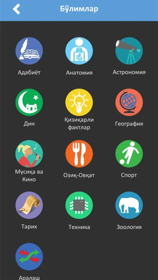 adabiyot, anatomiya, astronomiya, din, qiziqarli faktlar, geografiya, musiqa va kino, oziq-ovqat, sport, tarix, texnika, zoologiya