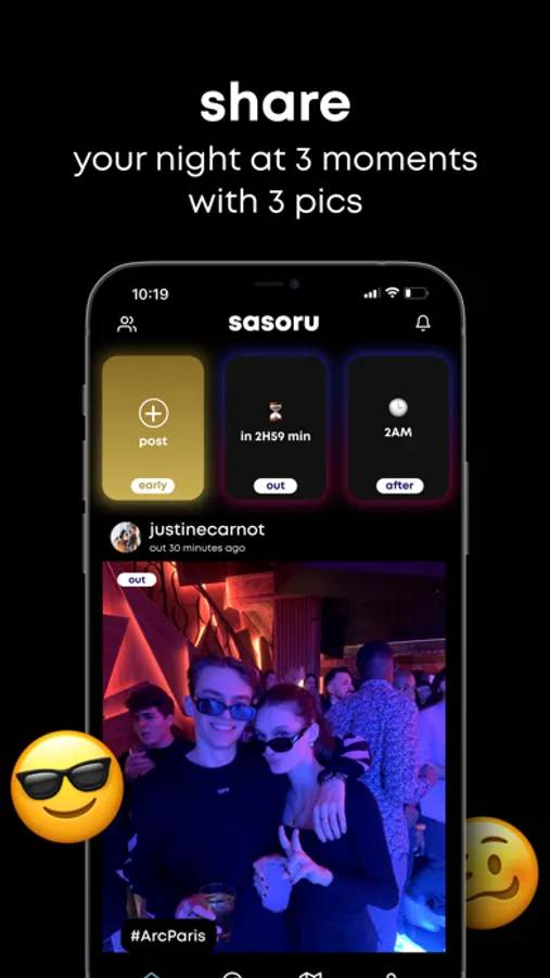 - sasoru brings your night to life with 3 pics at 3 moments: 10PM (Early), Midnight (Out), and 2AM (After).