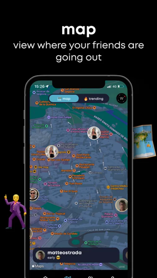 - Unfold the night's adventure using the map, showcasing your friends' Early, Out, and After locations.