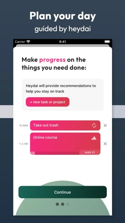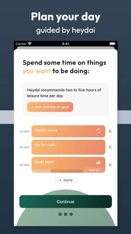 ‣ Plan your day with Heydai as your guide. Heydai learns patterns about your time and the things you need done to recommend a balanced agenda between productivity and leisure.