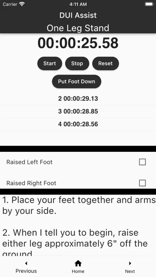 DUI Assist has built-in timers and tools to assist with field sobriety exercises.