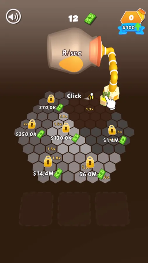 Do you want to make honey like a bee? Arrange the honeycombs on the grids as you wish and start the production. Tap fast and your combs will make more honey. Is it good to own the honey farm? Click more and earn money.