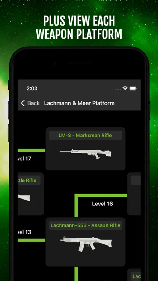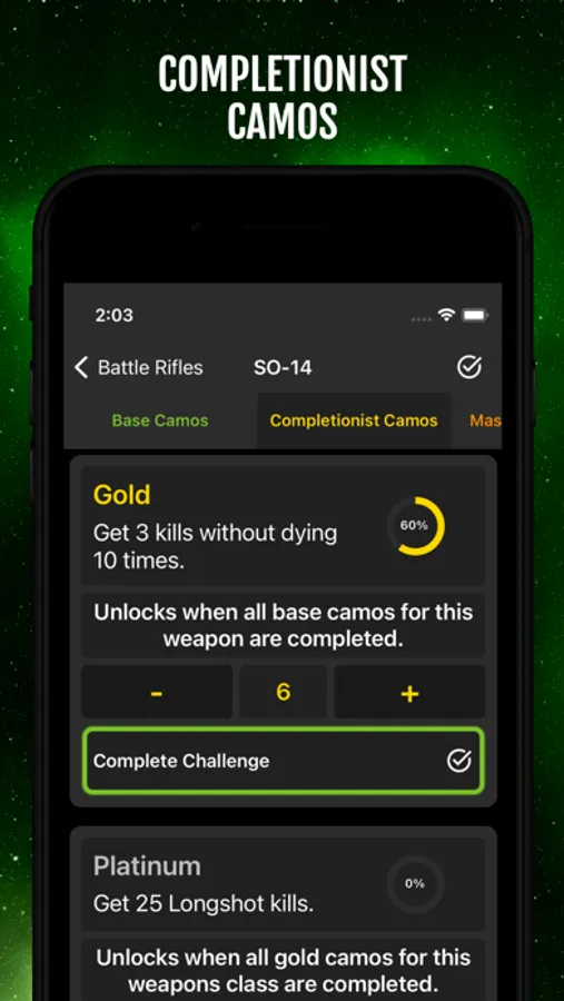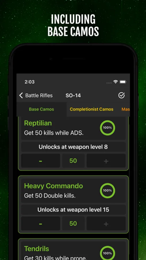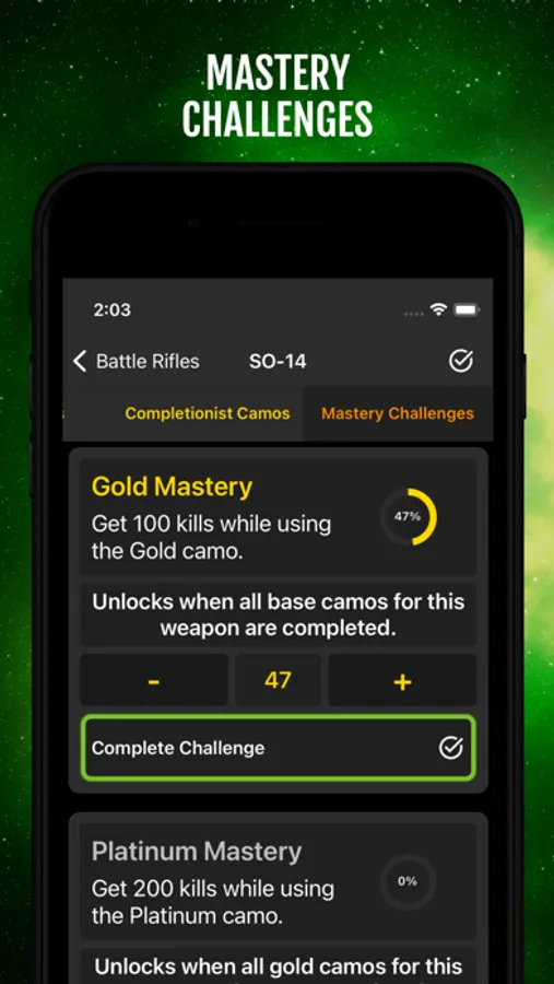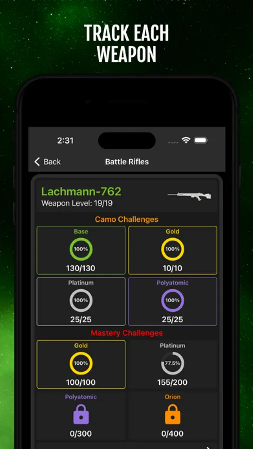 With MWII Multiplayer / Warzone 2.0, you can track each weapon, with progress tracking for each base camo, as well as Gold, Platinum, Polyatomic & Orion. Plus you can track the mastery challenges! All challenges are included in the app so you will know exactly what you need to do next. You can even view each weapon platform to see how each weapon is unlocked.