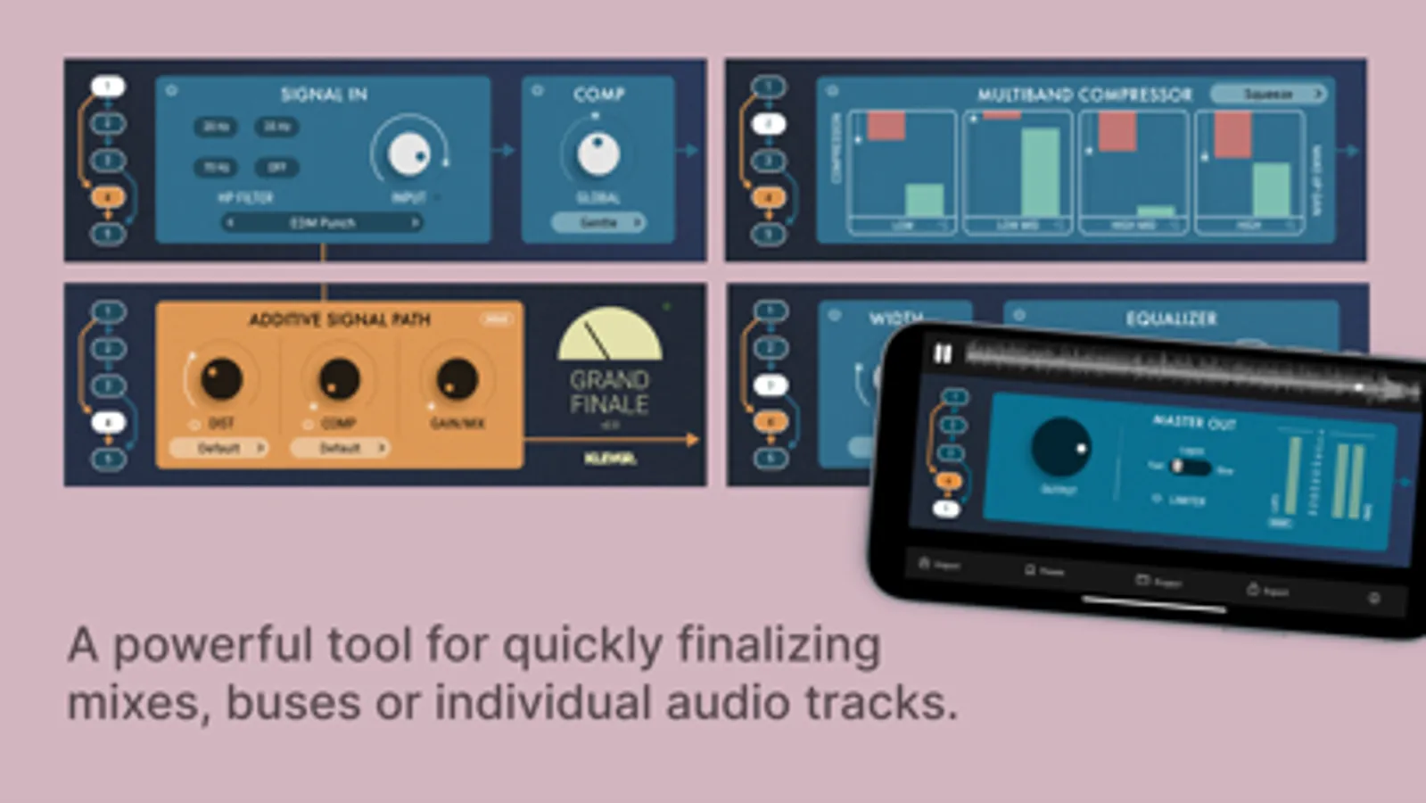 Grand Finale 2 is a multi effect audio processing application designed for finalizing complete mixes, stems, voice overs, buses and/or individual audio tracks. The plug-in offers several modules in a pre-routed configuration. Each module has parameters to alter, and most modules offer a set of algorithms to select. These features come together to make Grand Finale a powerful tool for quickly finalizing a track, bus or mix.