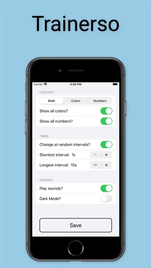 Trainerso is an app to help train a player's ability to check their shoulder and identify what is going on around them. Simply set up your session settings and set your device in a location you want your player to check. Press start and begin your drill. It's that easy! You can set it to show colors, numbers, or both! You also have the ability to set the timer interval in which it changes. This time interval can be a constant time like 10 seconds or you can set it to change at random intervals between two different times like 5-15 seconds to keep the player guessing. You have the ability to set your preference of light or dark mode within the app without having to change it device-wide and you also have the option to play an audible sound that triggers when the screen changes to a new number and/or color (be sure to turn on Ringer and Alerts and set to full volume in Settings!). There are a total of 6 different colors to choose from (or use them all!) and you can use all of the numbers 0-99 or specify your own subset to use within that range. All settings that you set are persisted once they are saved allowing you to easily start your next session without having to set it all up again saving you time to focus on the training. This is a must have app for those wanting to take their game to the next level and dominate on the pitch!