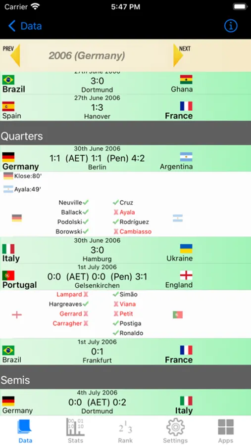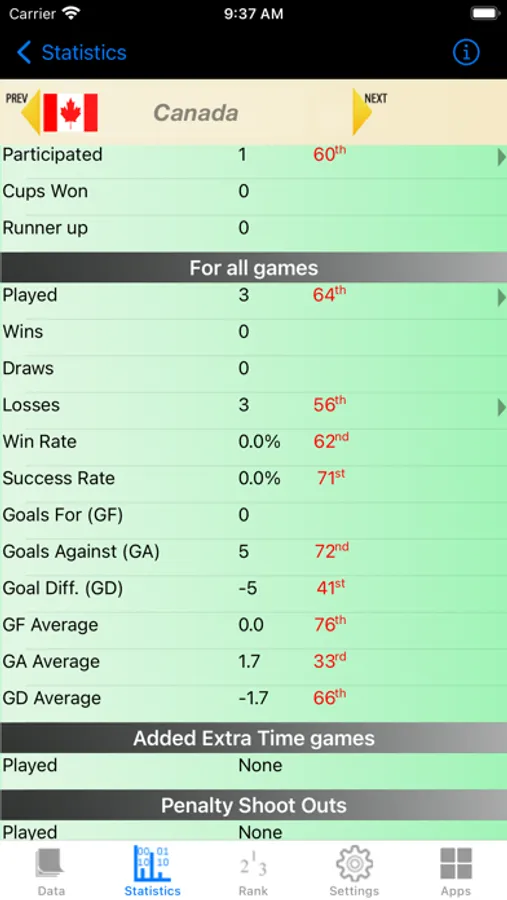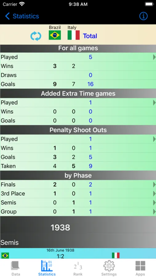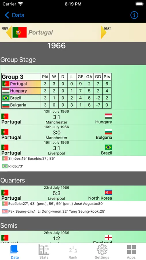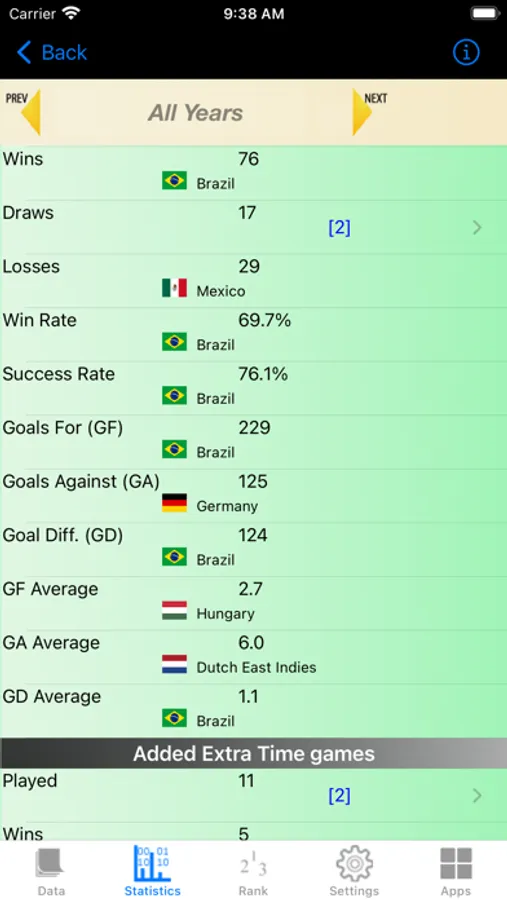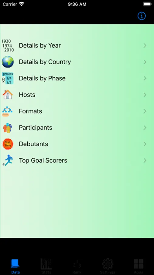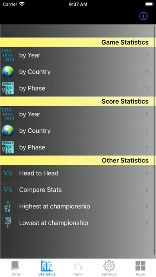 App which can make you a Football World Championship Info and Stats guru or just have interesting data at your finger tips. Brings data from across all the tournament years and formats from 1930-2022 and provides you the information, statistics, records and ranking for all. Data is made available by Country, by Year or by Phase of the tournament.