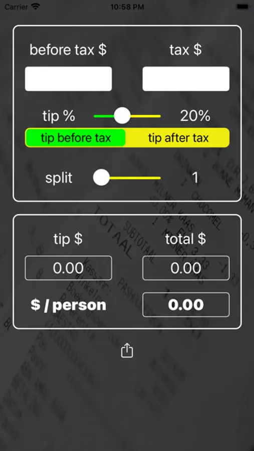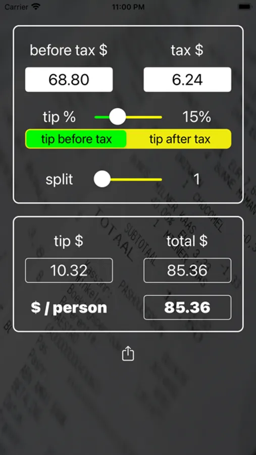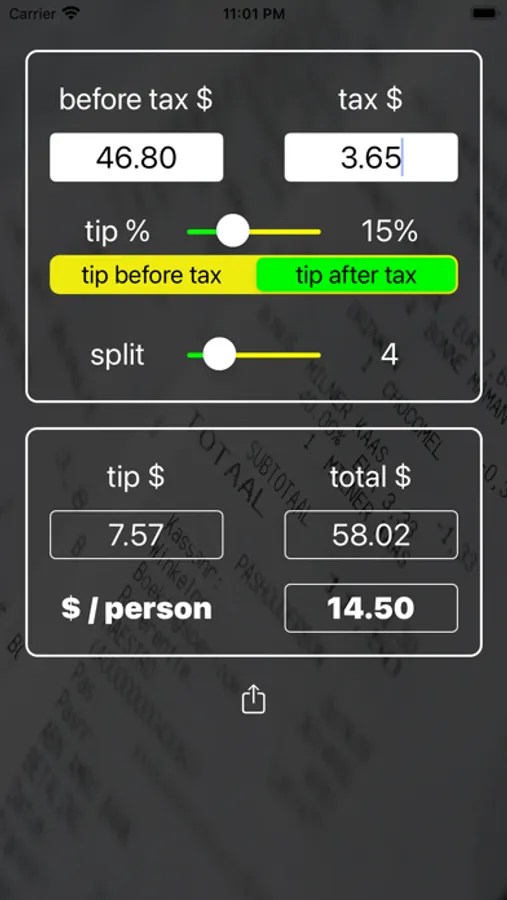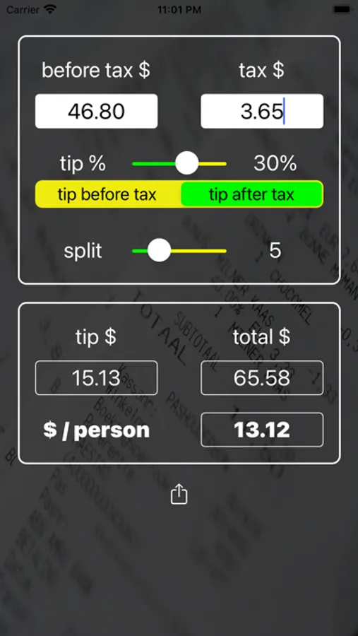 The Handy Tip Calculator allows users to select a tip percentage, for the bill amount either before tax or after tax. Then it calculates the tip amount based on the selection. Then the total amount is calculated by adding up the bill amount before tax, tax, and tip. Then the total bill amount is divided by the number of people to split the bill and shows the amount for each person's bill. Users can save or share the summary of the bill and calculation by message, email, or any social media. Most of the other apps for tip calculation don't give users the options to choose, either before tax tip or after tax tip.