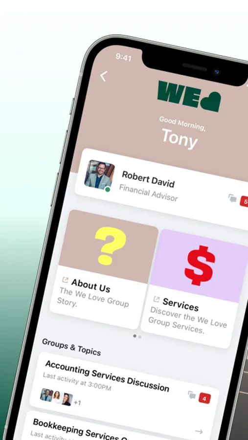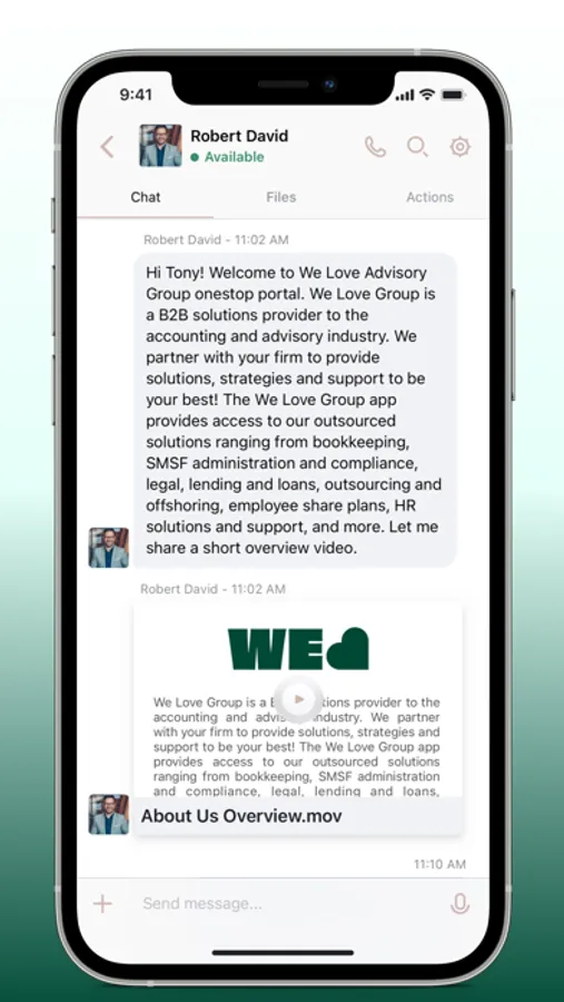 The We Love Group app provides access to our outsourced solutions ranging from bookkeeping, SMSF administration and compliance, legal, lending and loans, outsourcing and offshoring, employee share plans, HR solutions and support, and more. With interactive features like secure messaging, document sharing, e-signature, task management, calendaring, file annotation, and video meetings, our app enables a streamlined solutions provider experience from the convenience of your phone.