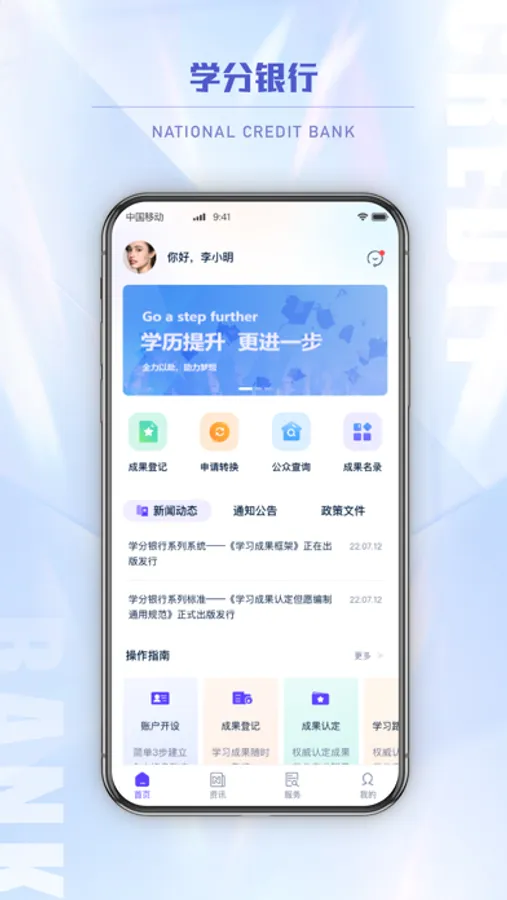 学分银行提供个人学习账户和机构账户的建立与管理,个人学习成果的登记、认定、存储、积累、转换以及终身学习档案的建立、学习信息记录和学习信誉查询、学习成果相关证明等服务。机构用户基于学分银行学分,具体制订学习成果转换办法,实施有关学习成果的转换。