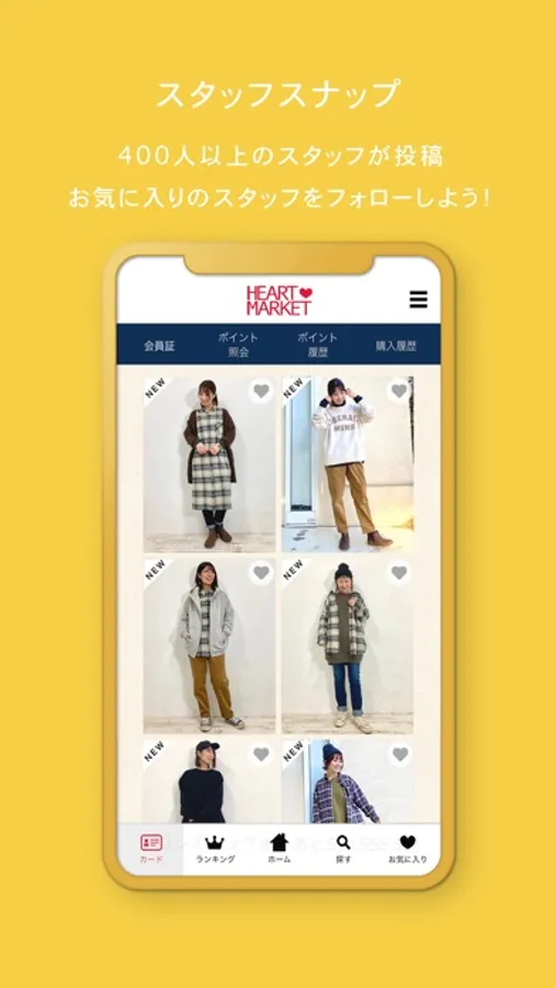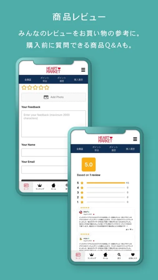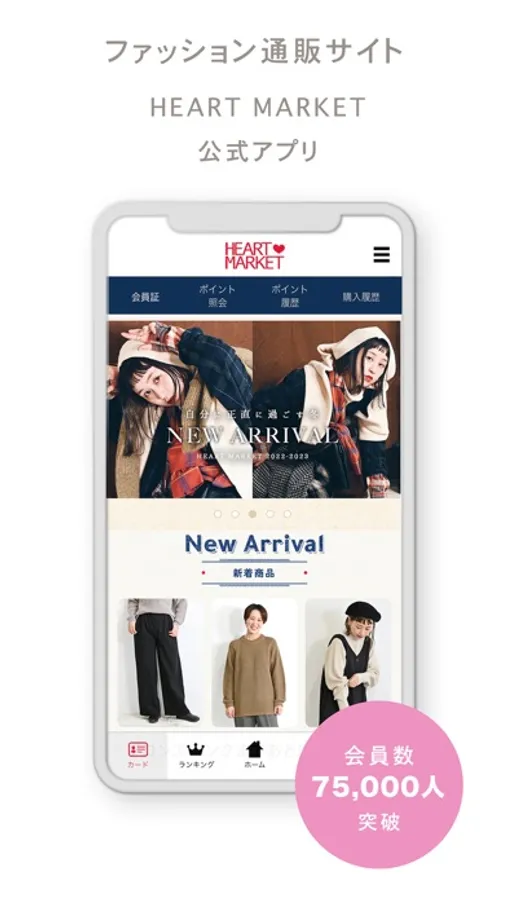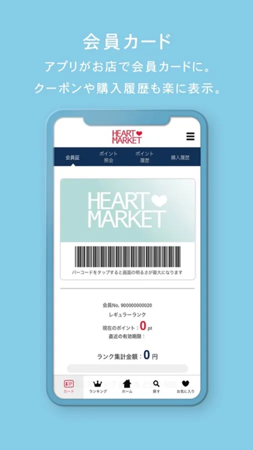 「ハートマーケット」アプリは、対象店舗にて会員証としてご利用いただけるだけでなく、オンラインショップでのお買いものができるアプリです。最新の情報をお届けしますので、便利にお得にご利用いただけます。