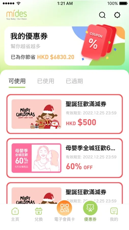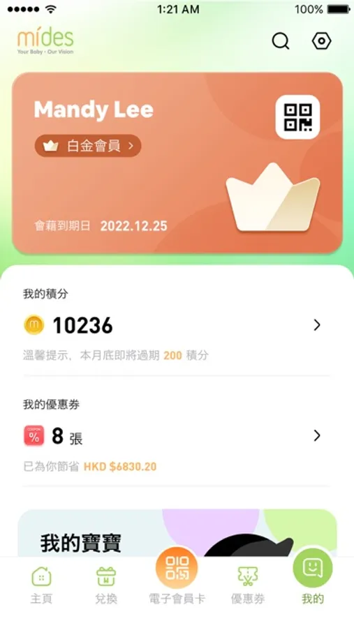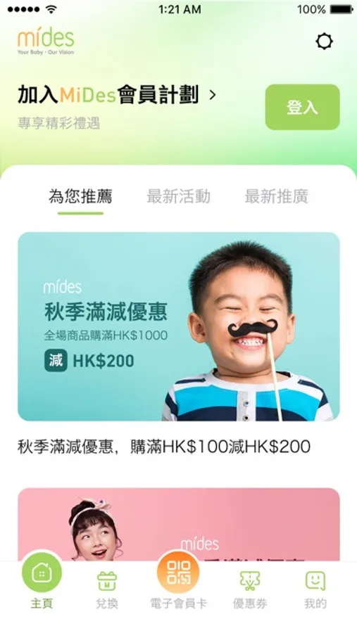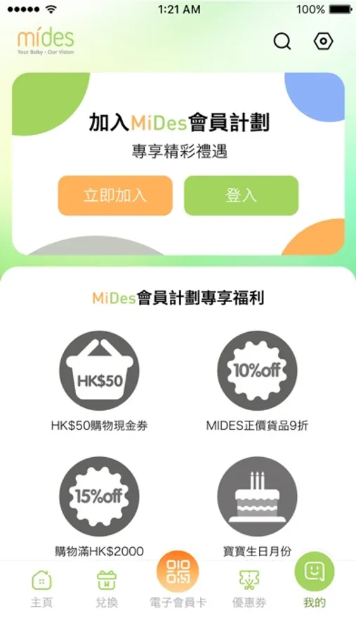 會員憑APP內的電子會員卡,在MiDes門市或網店上消費,即賺取累積積分,兌換豐富獎賞! 立即下載及免費登記成為VIP,為你BB慳得更多!