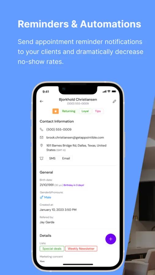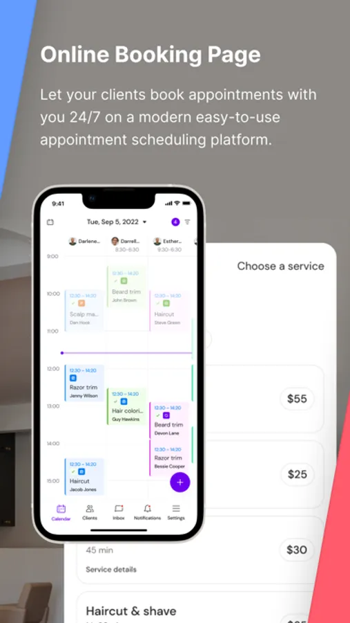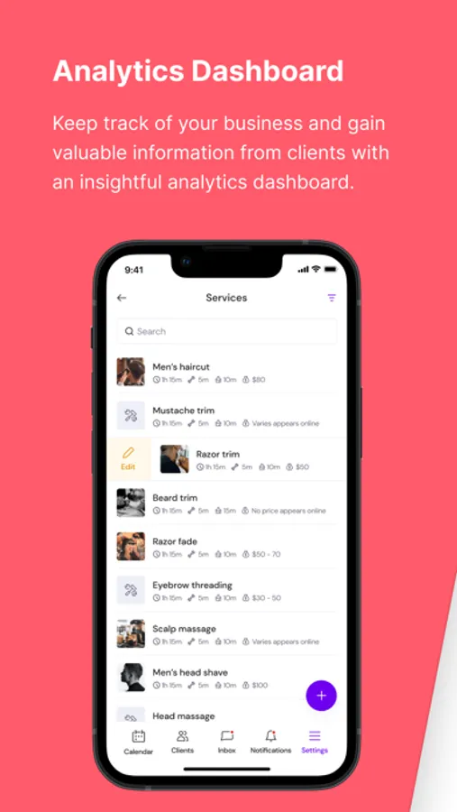 - Client management (CRM): search for clients, view the history of their visit, take notes, and add before and after photos.