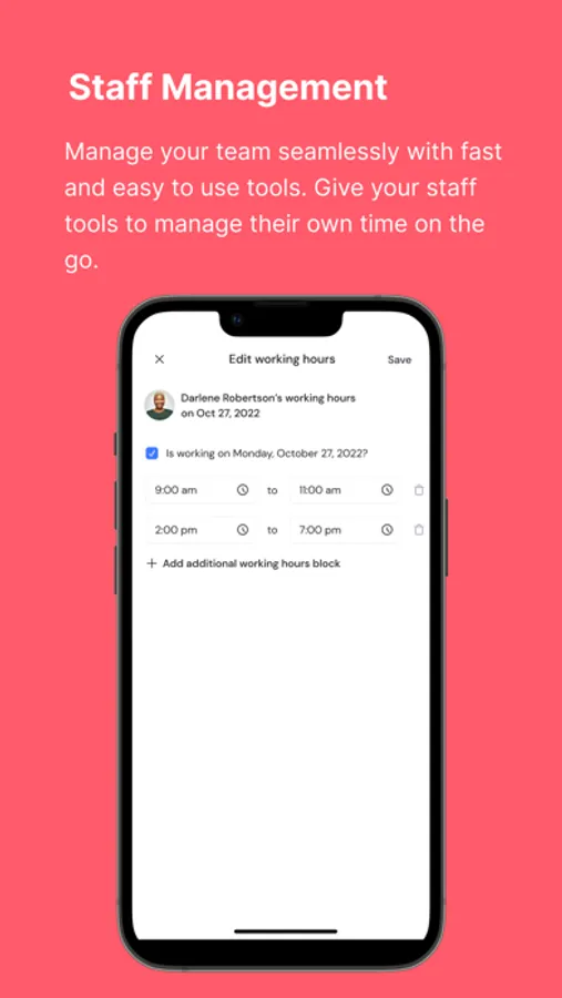 - Staff management: add your admin and bookable staff members, grant access permissions for each user, and effectively organize your team in one place!