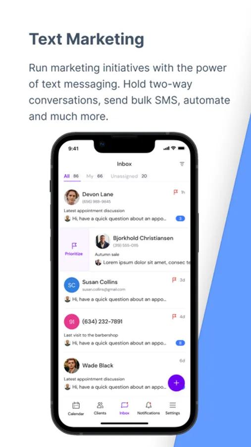 - Text marketing: send rebooking reminders, send mass texts to your clients with a promotion or update.