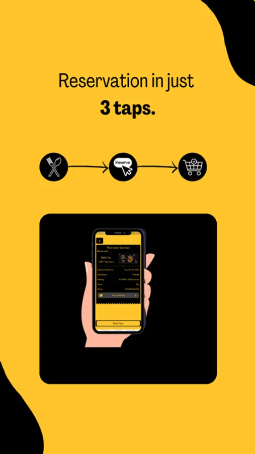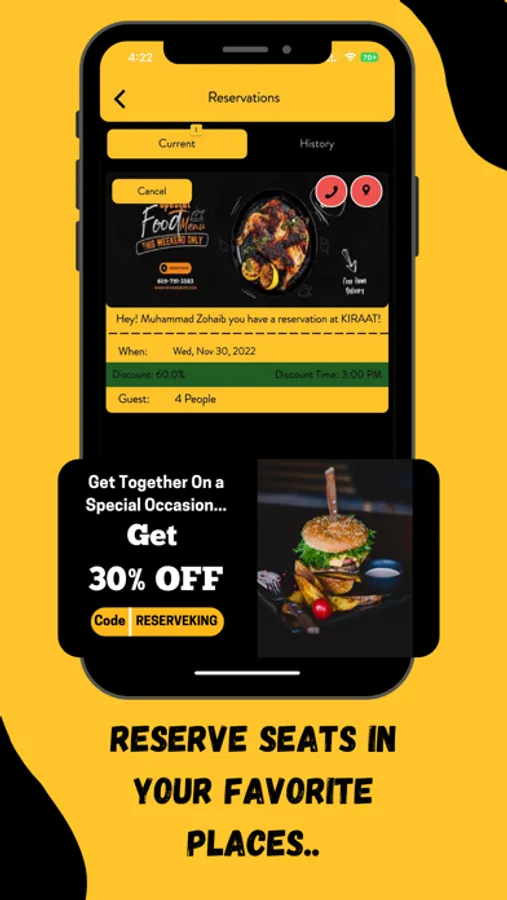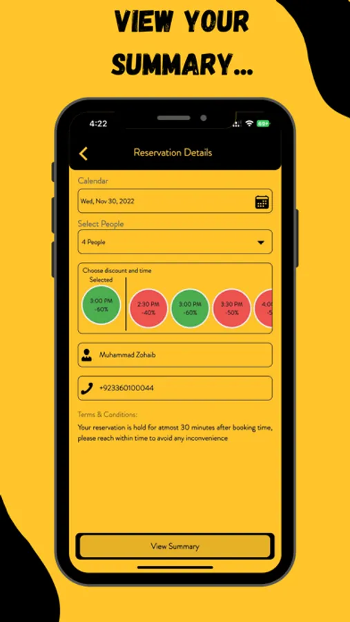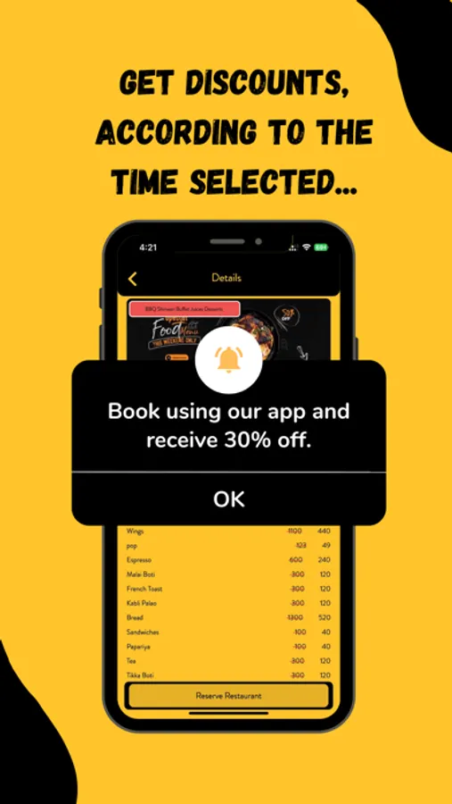 Customers have to add their number for verification of their identifications. They can then look at different menus at the homepage of various restaurants. Time specific discounts will also be shown to customers so that they can choose accordingly. The avail screen will show the discounted menu as selected by the customer which will change according to different times. Customers then have to reserve a restaurant, a reservation screen will appear where the customer has to select a reservation date and the number of people for the reservation booking as well. The customer will then click on 'book now' to reserve a booking in their desired restaurant at their chosen time.