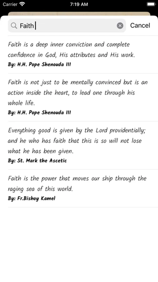 User can find up to four random coptic quotes each time opening the app. User can search by topic or author through all the quotes and also can share favorite quote.