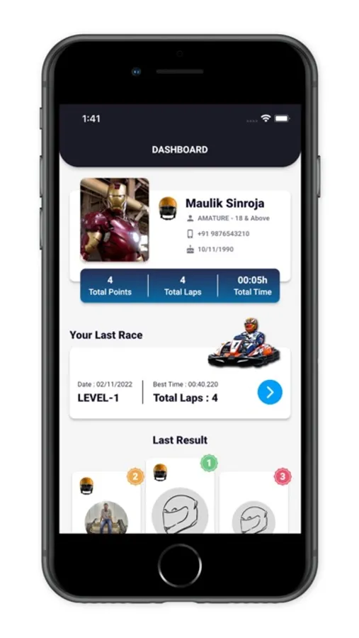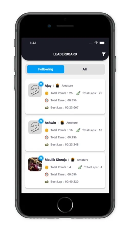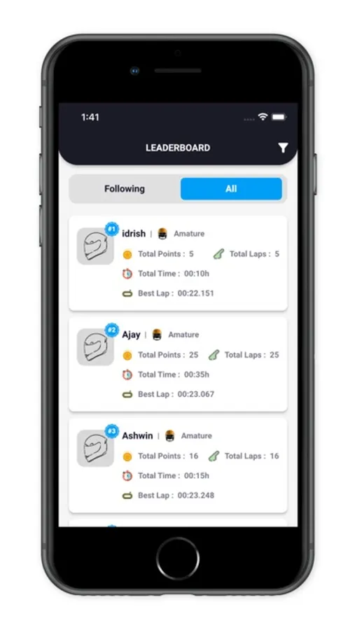 - Accumulated dashboard for Total Points, Total Laps and Total Time.