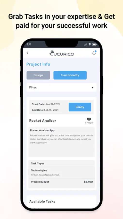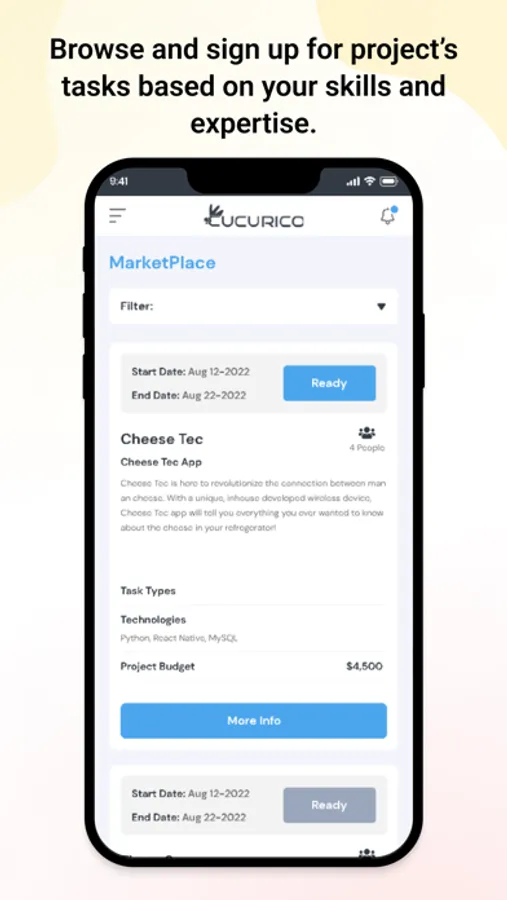 ⁃ Browse and sign up for project’s tasks based on your skills and expertise.