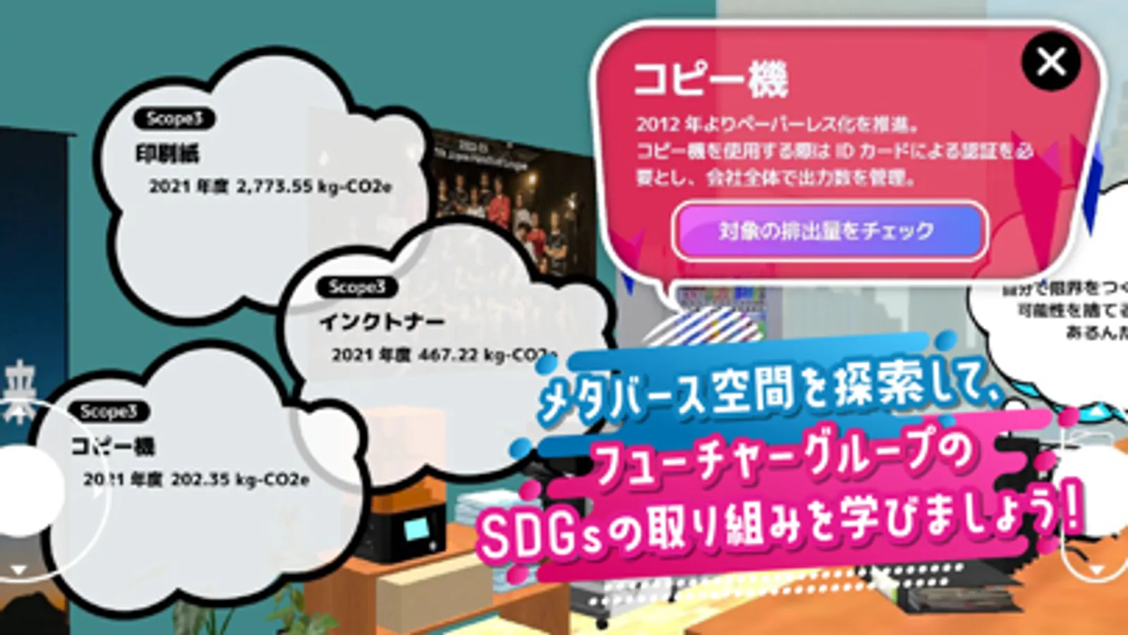 グループ各社の排出量削減に向けた取り組みを分かりやすく伝えるため、オフィスの一部を再現したメタバース空間を散策しながら、