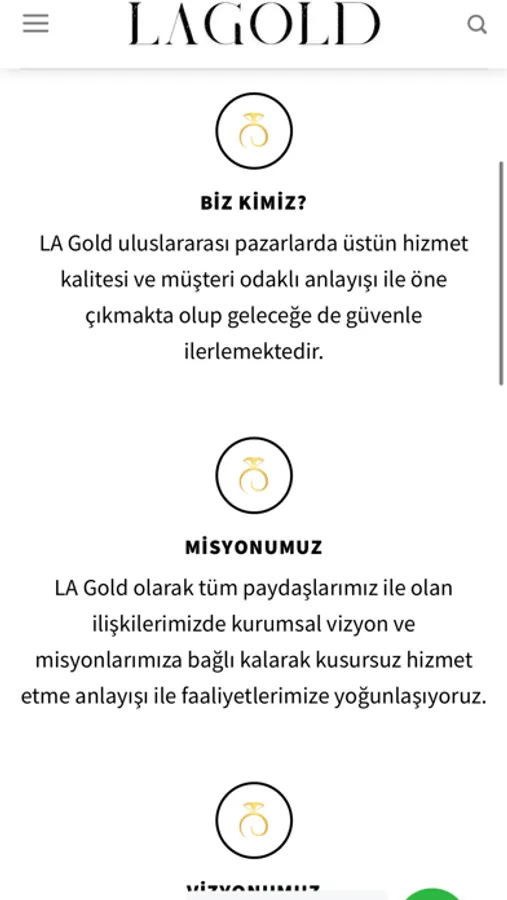 LA Gold olarak tüm paydaşlarımız ile olan ilişkilerimizde kurumsal vizyon ve misyonlarımıza bağlı kalarak kusursuz hizmet etme anlayışı ile faaliyetlerimize yoğunlaşıyoruz.