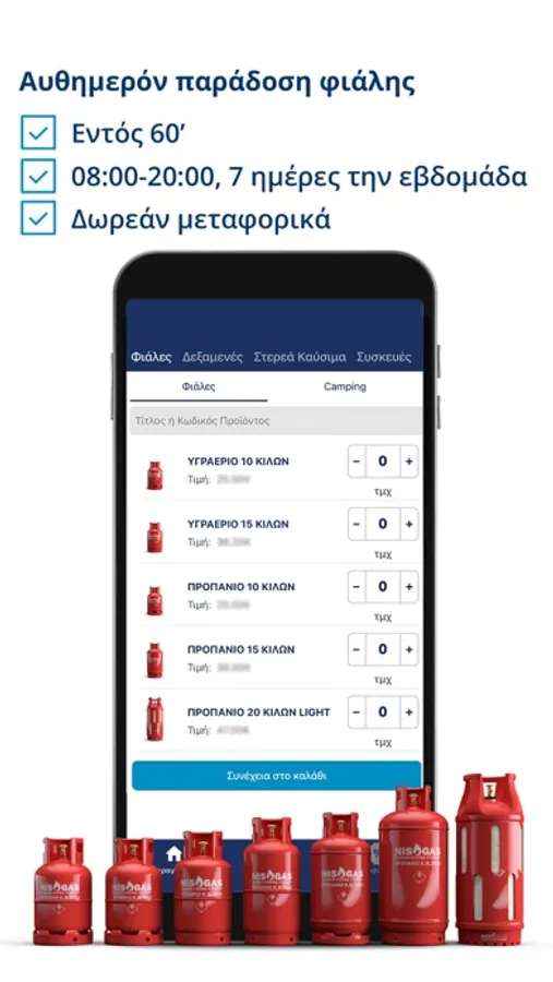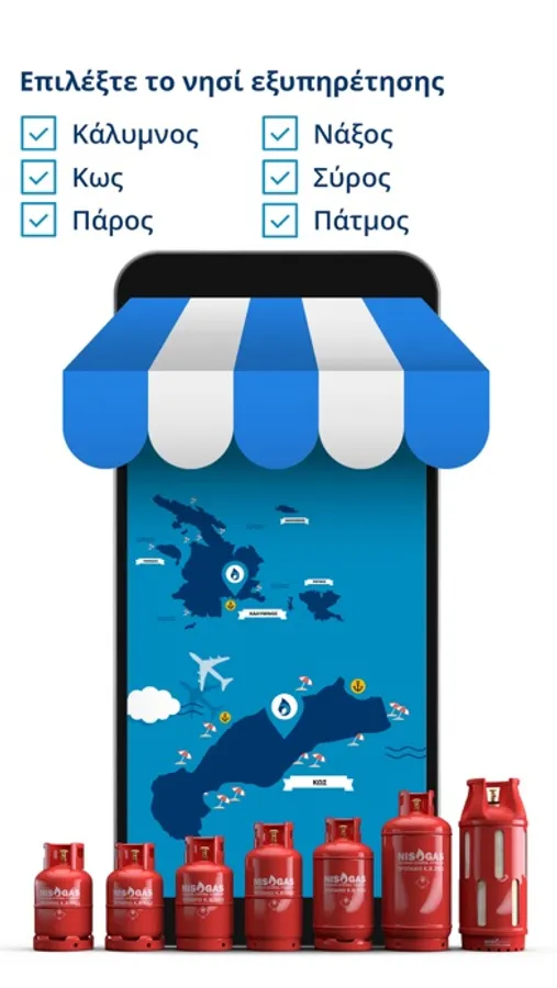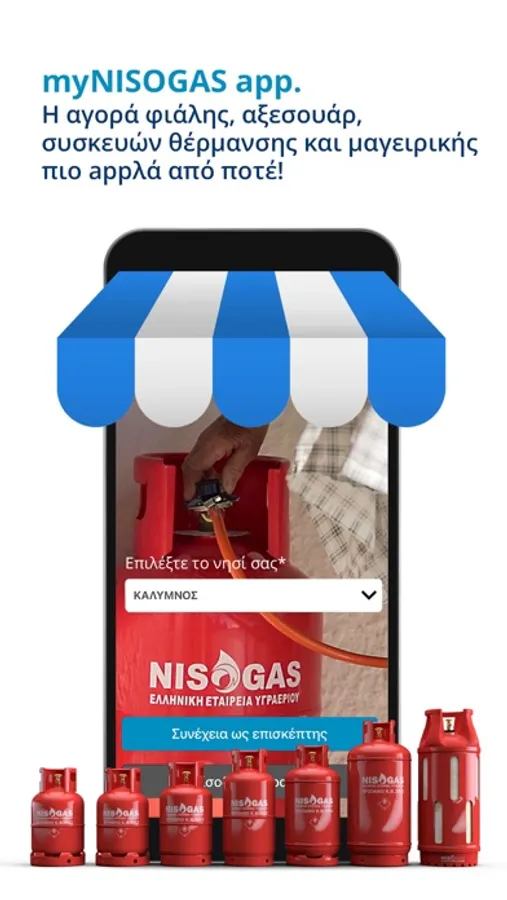 Με τη νέα έξυπνη και φιλική στη χρήση εφαρμογή myNISOGAS app, η αγορά και αντικατάσταση φιάλης, αλλά και η προμήθεια αξεσουάρ και ανταλλακτικών, γίνεται appλή υπόθεση! Ο πιο γρήγορος τρόπος για να παραγγείλετε Φιάλες υγραερίου, (Υγραέριο-Προπάνιο), συσκευές υγραερίου, Στερεά καύσιμα (Προσανάμματα) και αξεσουάρ.