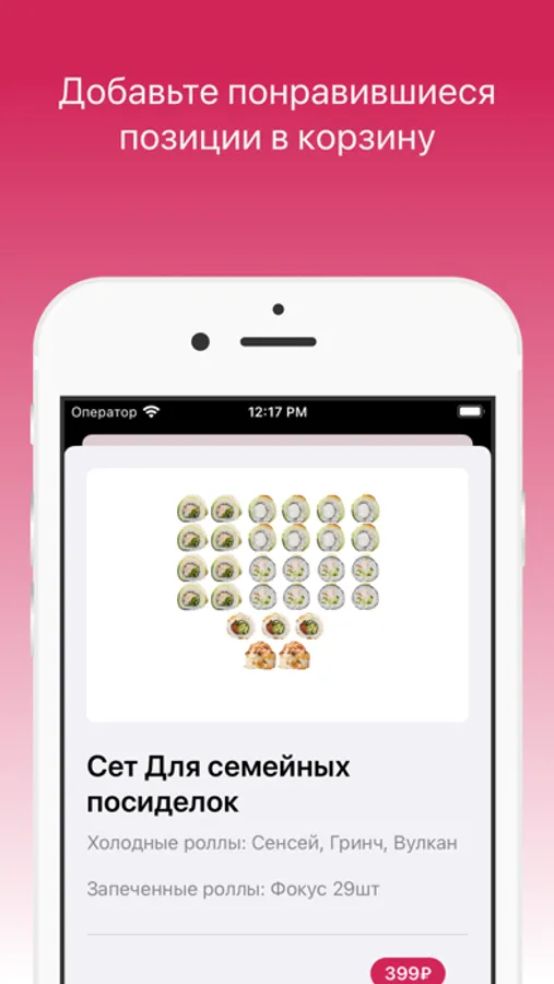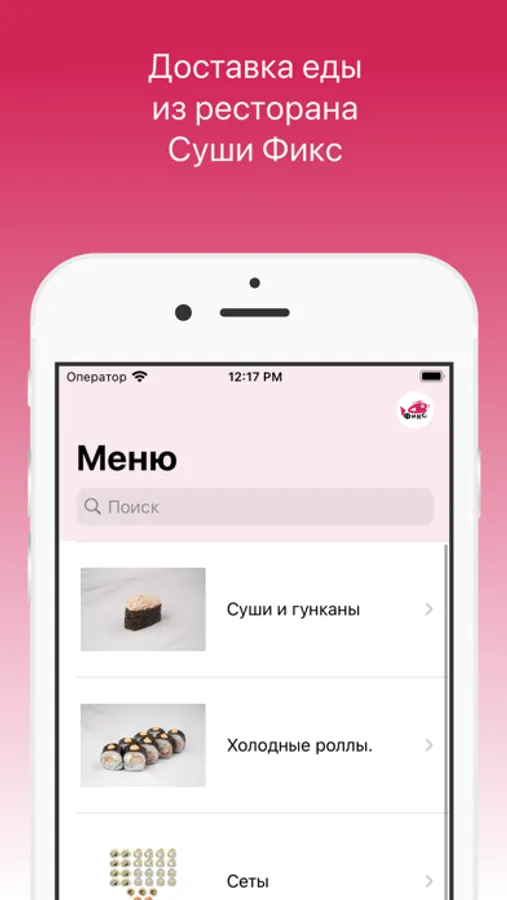 Как сделать заказ в приложении “Суши Фикс”: выберите понравившиеся позиции из меню, добавьте их в корзину и перейдите на экран оформления заказа (по нажатию на иконку корзины).