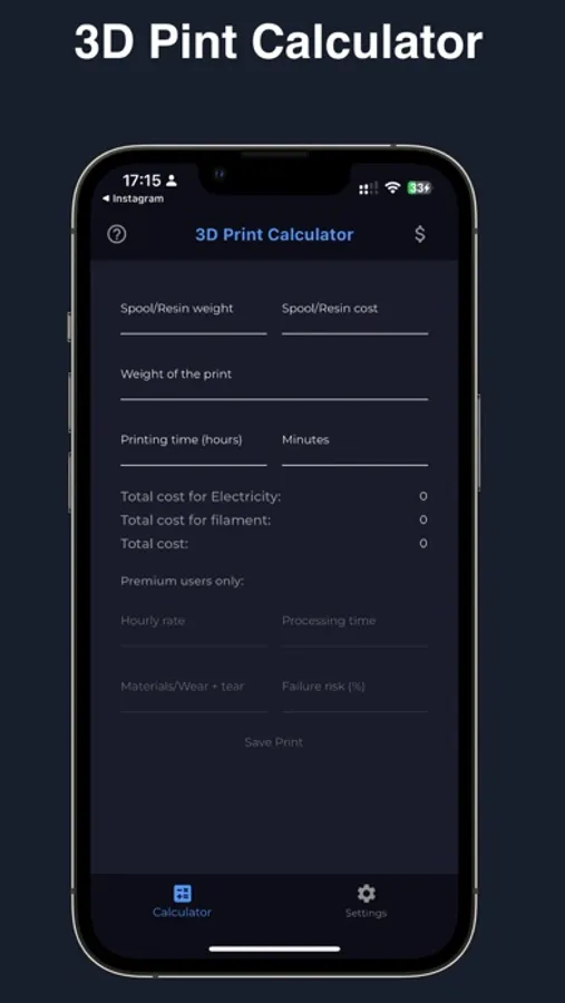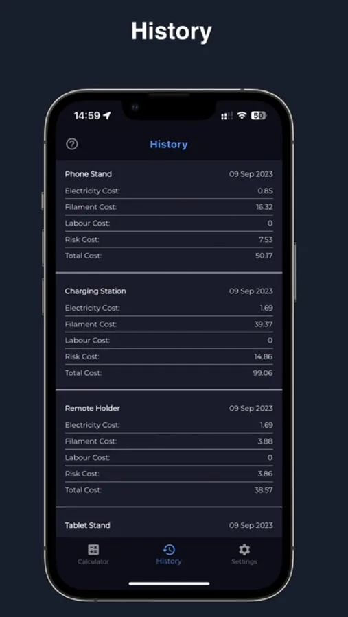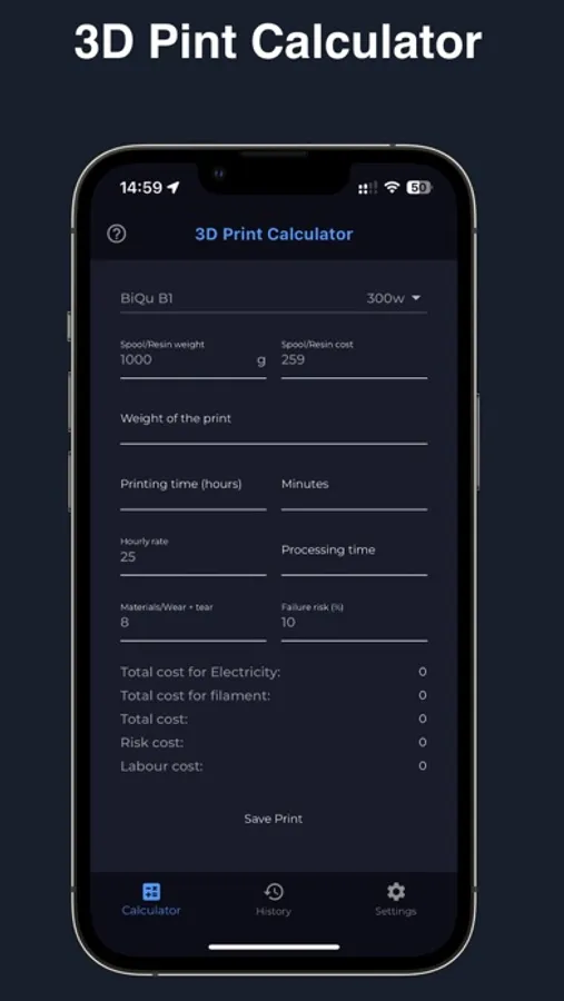 For those needing a bit more details, or looking to use their printer as part of a side hustle, we have additional fields available for calculations as well as the ability to save prints and view the costings from the history screen.