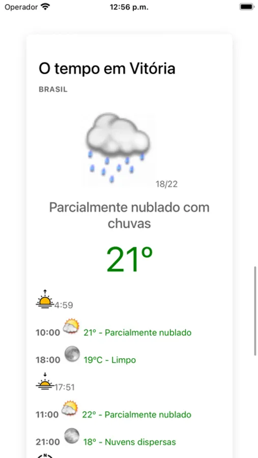 Ao final da página sobre a cidade, podemos ver a informação completa sobre a temperatura atual por horas, a máxima e a mínima do dia e para os próximos 7 dias. Incluindo informação sobre o nascer e o pôr do Sol e da Lua, a velocidade do vento e sua direção e a probabilidade de chuva.