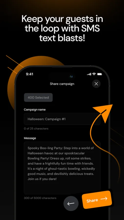 Text Blasts: Hosts can send out text blasts to invite their past guests to upcoming events.