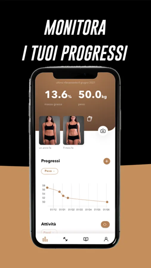 Avrai sempre sotto controllo la tua attività fisica: potrai visualizzare quali esercizi sono previsti nel tuo piano di allenamento, i tuoi progressi e come cambia il tuo fisico nel corso del tempo.