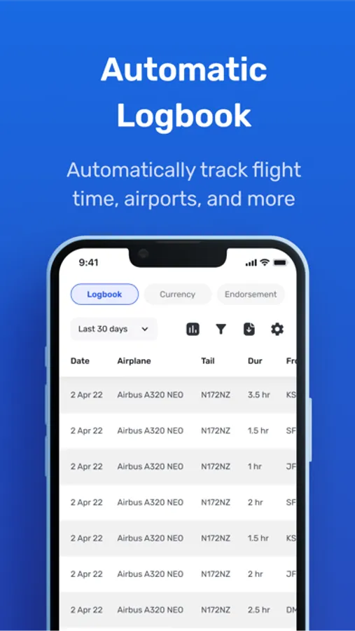 Following also has a built-in automatic logbook complete with powerful charts. Easily track your currency, flight hours, and much more. The app is completely free to use.