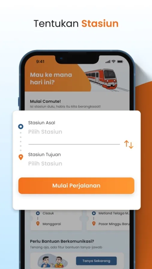 TENTUKAN STASIUN - Cukup isi stasiun asal & tujuan, lalu tekan ‘Mulai Perjalanan’ dan kamu bisa langsung mulai perjalanan naik KRL ditemani Comute.