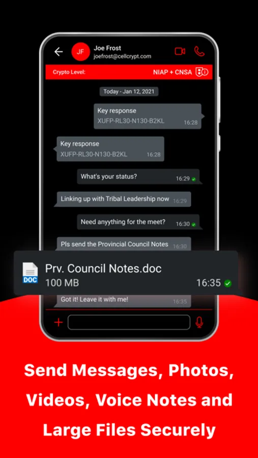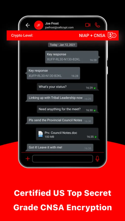 Obsidian Ghost Federal provides secure instant messaging with the ability to send photos, videos, voice notes, and large files of any kind. All messages and files are end-to-end encrypted with a new key generated for every message or file sent. Obsidian Ghost Federal’s enhanced Data at Rest encryption protects all files and media stored within the app.