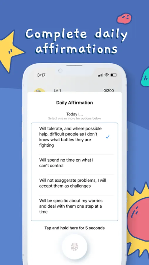 Need to remind yourself to be grateful? Use our daily affirmation that requires you to hold a button for 5 seconds to complete. No more mindless tapping to complete your goals!