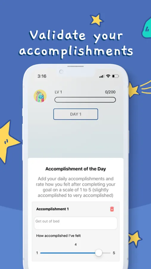 “Love how you can rate how accomplished you felt after each goal! It helps remind me what makes me feel good when I’m depressed.’