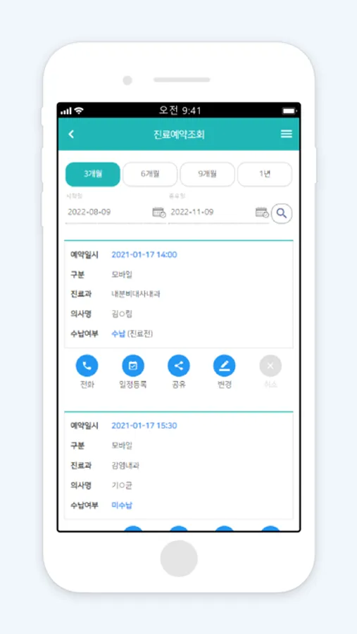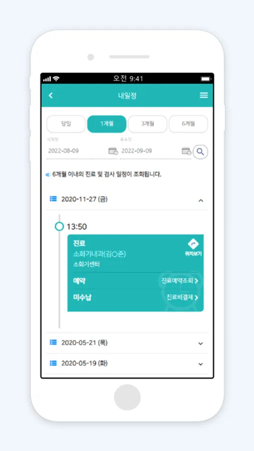 병원에서의 진료일정을 한번에 보실 수 있습니다.
