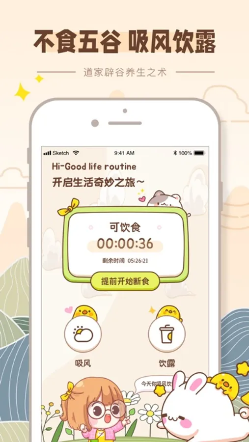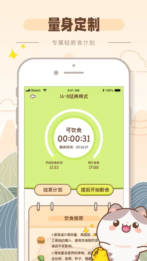 根据你选择的计划,app会定时提醒你什么时候可以饮食,什么时候是在断食中,不能饮食。