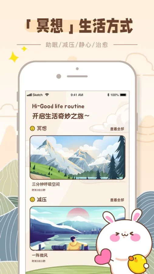 每天睡觉前打开app,找到冥想减压功能,伴随着轻柔的音乐,放空自己,放松自己的身心。