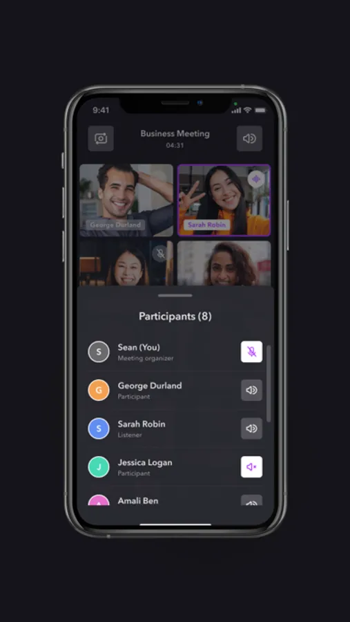 * Standard functions like muting, camera selection, video on/off, who’s speaking, participant names, and more