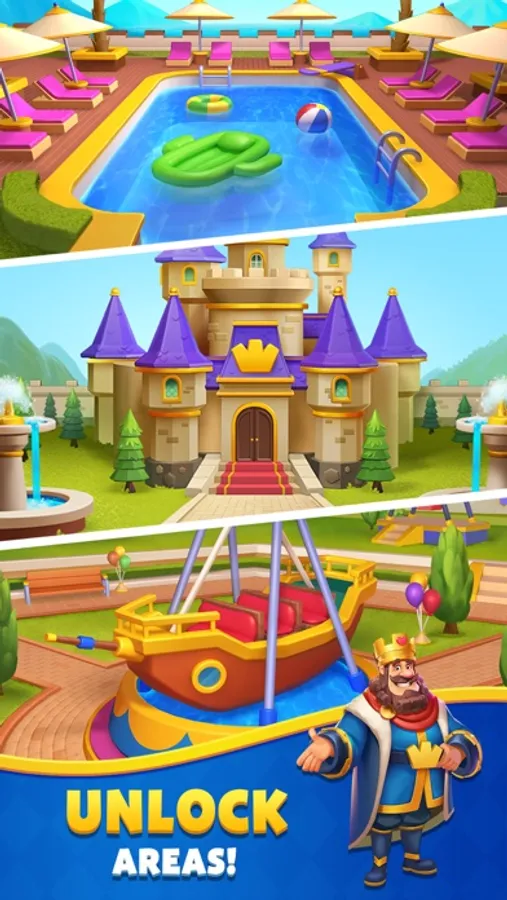 Enjoy the rich building elements, clear stages, collect starts, and build your own kingdom in this royal-themed game!