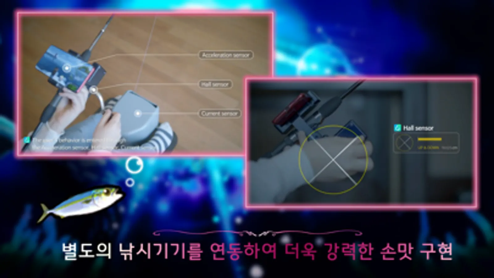 센서를 통해 사용자의 움직임을 읽어 낚시 동작 유도하며 모터를 통해 사용자에게 낚시의 손맛을 전달합니다.