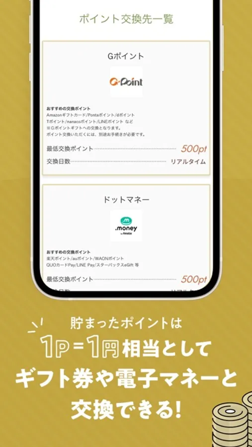 貯まったポイントは、1P=1円相当として、各種ギフト券、共通ポイント、電子マネーなど様々なサービスに交換できます。