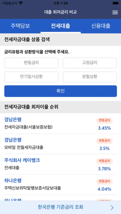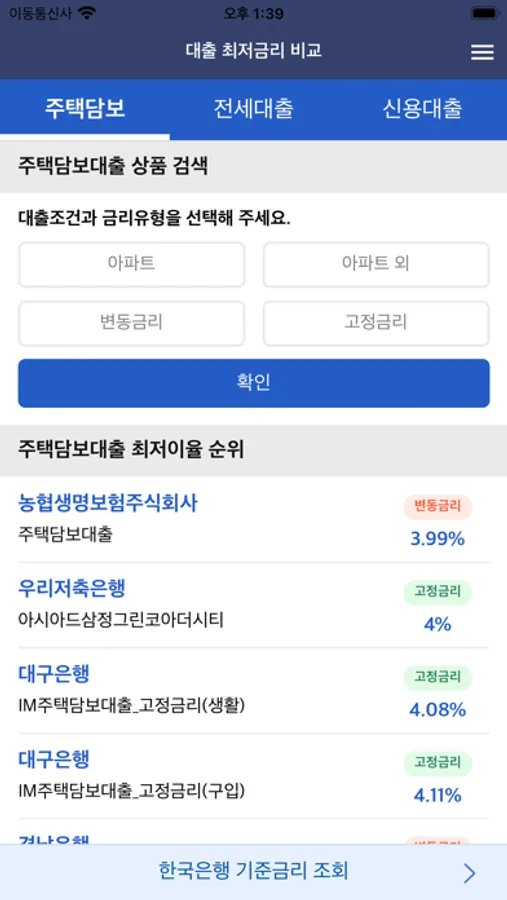 대출 최저금리 비교 앱은 주택담보 대출, 전세대출, 신용대출 등 다양한 대출상품을 빠르게 비교해 드립니다.