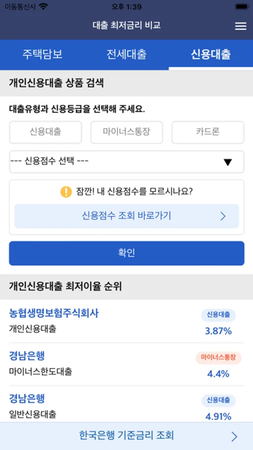 신용대출, 마이너스통장 (마통), 카드론 등의 상품도 신용점수에 따라 이용 가능한 상품을 바로 찾아 비교해 드립니다.