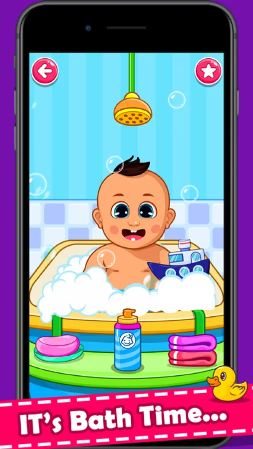 Baby Bath : Pamper your baby with indulgent bathing. Before bath time, choose a few toys to make the baby jump for joy. Then wash the baby with some soap and shampoo and wipe him softly with a towel. Let's have fun popping soap bubbles.