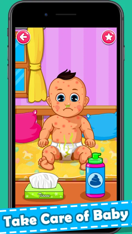 Baby Care : Baby Care lets you take care of the Cutest Baby Ever! You can clean the nose, change the dirty diaper, brush their teeth, feed the milk and Babysit this adorable Baby.