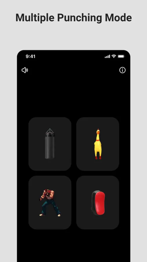 Punching bag, screaming chicken, cartoon fighters, punching mat... Pick your favorite mode and give it a punch!